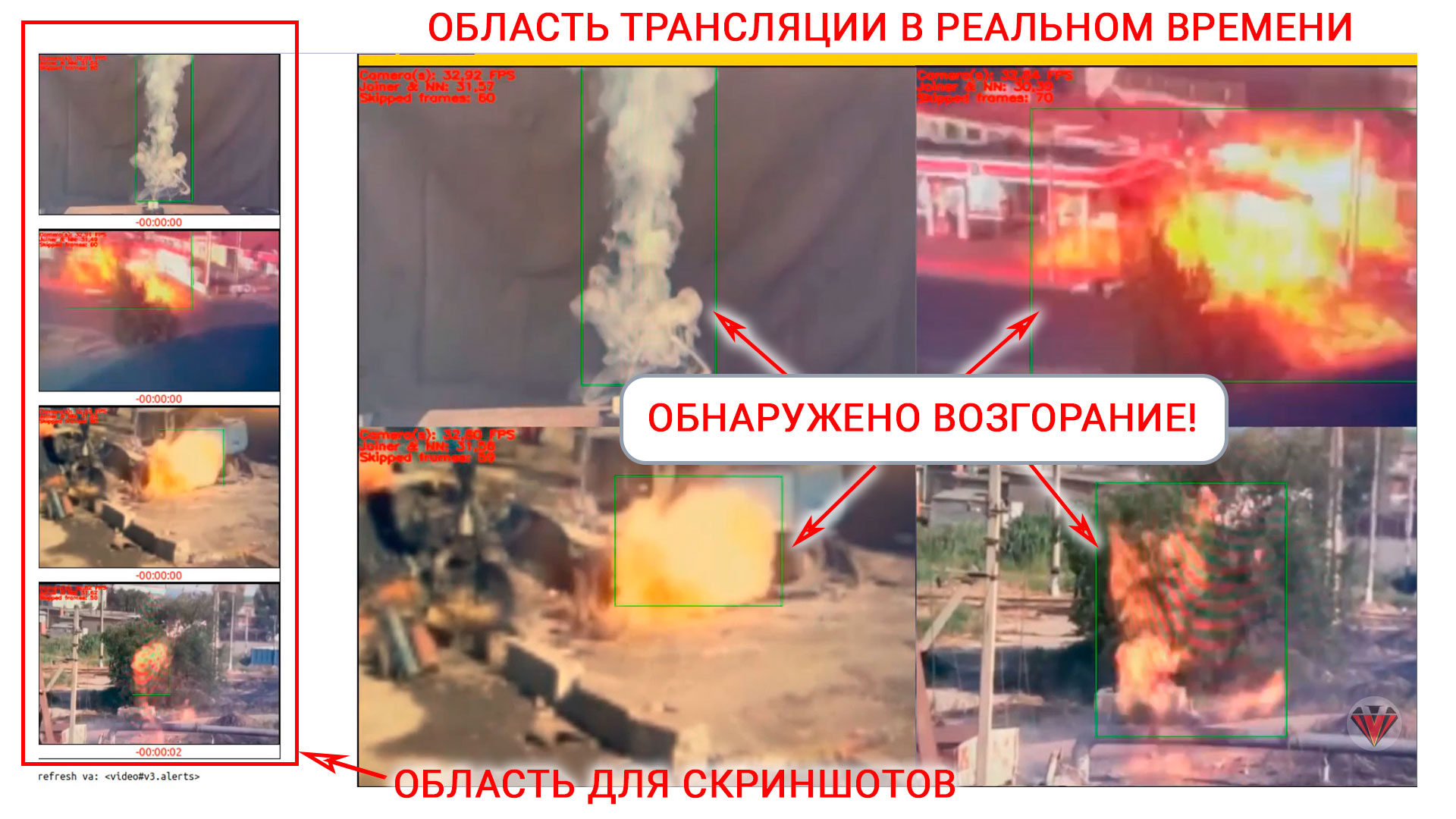 Искусственный интеллект в режиме реального времени обрабатывает входной видеопоток с камер наблюдения и анализирует его на предмет присутствия дыма и/или открытого огня.